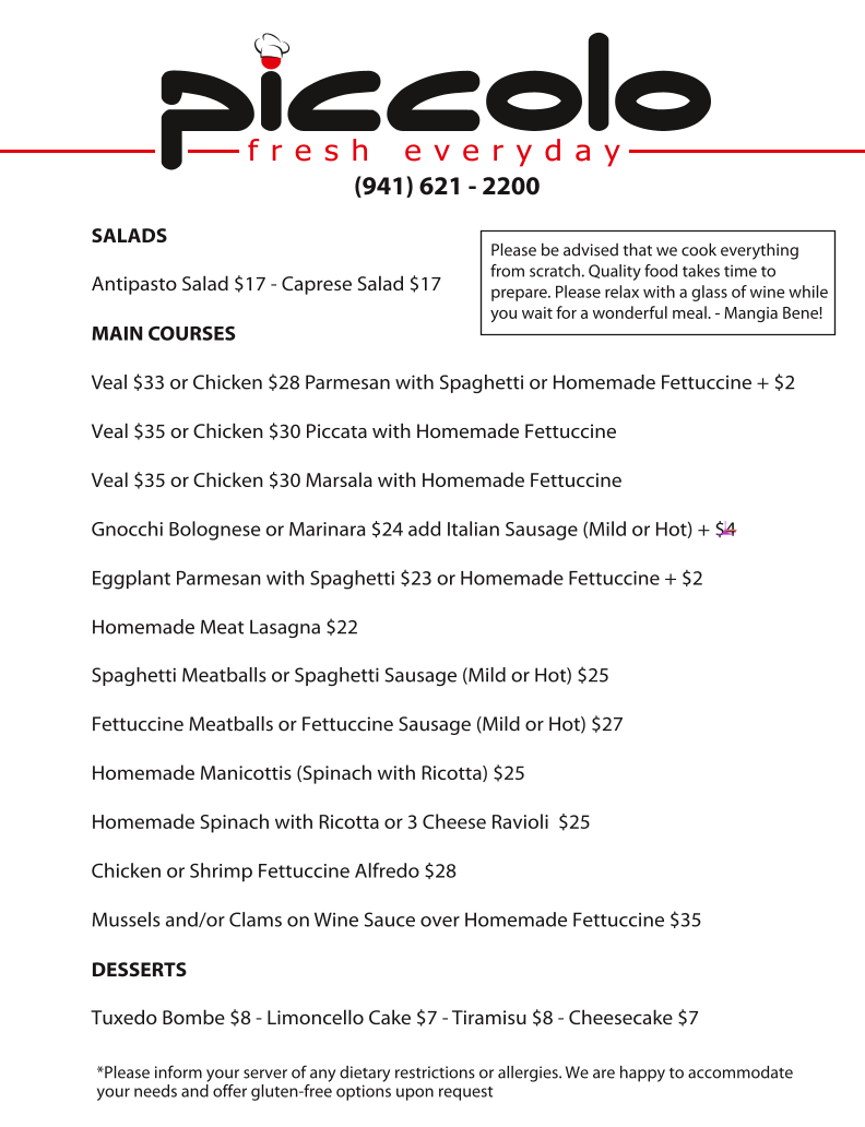 The Piccolo Italian Restaurant Menu is a delightful journey through authentic Italian flavors, nestled in the heart of Punta Gorda, FL. Whether you're in the mood for a comforting pasta dish, a fresh, crisp salad, or a savory pizza topped with the finest ingredients, this menu has something to satisfy every craving. Each dish is crafted with care, offering a taste of Italy's rich culinary heritage, all prepared using locally sourced ingredients. With options ranging from classic spaghetti and meatballs to unique seafood specialties, there's a dish for everyone. Pair your meal with a glass of wine from their carefully selected list, and enjoy the cozy atmosphere that makes Piccolo the perfect spot for a casual dinner or a special celebration.